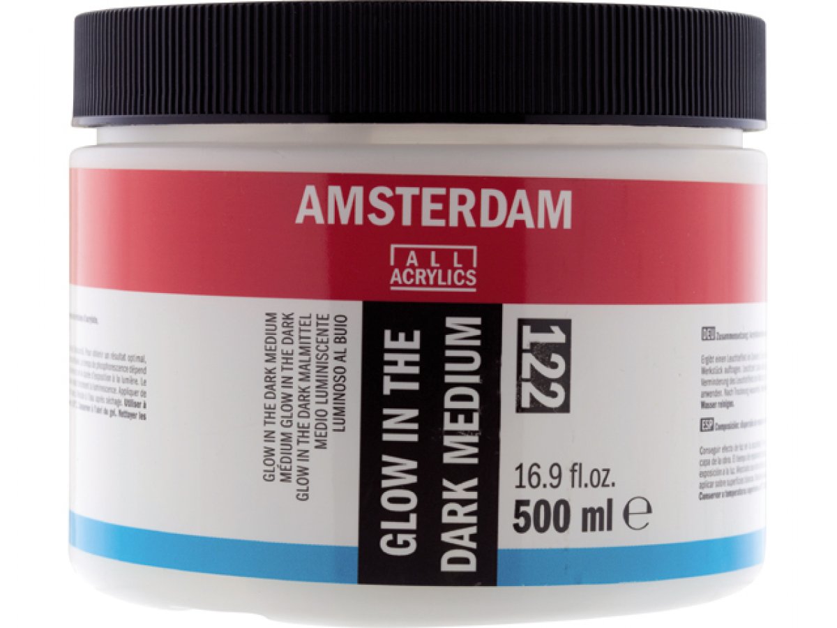 Dodajte dodatnu dimenziju svom radu uz Amsterdam glow in the dark medij. Zahvaljujući fosforescentnom pigmentu, područja obojena ovim medijem će svijetliti u mraku dugo nakon nanošenja. Nemojte miješati ovaj medij s akrilnom bojom, jer ćete tako ukloniti efekt sjaja u mraku. Nanesite medij kao završni sloj na za optimalne rezultate. Vrijeme sjaja uvelike ovisi o izvoru svjetlosti i trajanju izlaganja svjetlu. Miješanje s drugim bojama uvelike će smanjiti efekt sjaja. Vodootporan kada se osuši. Očistite pribor vodom.